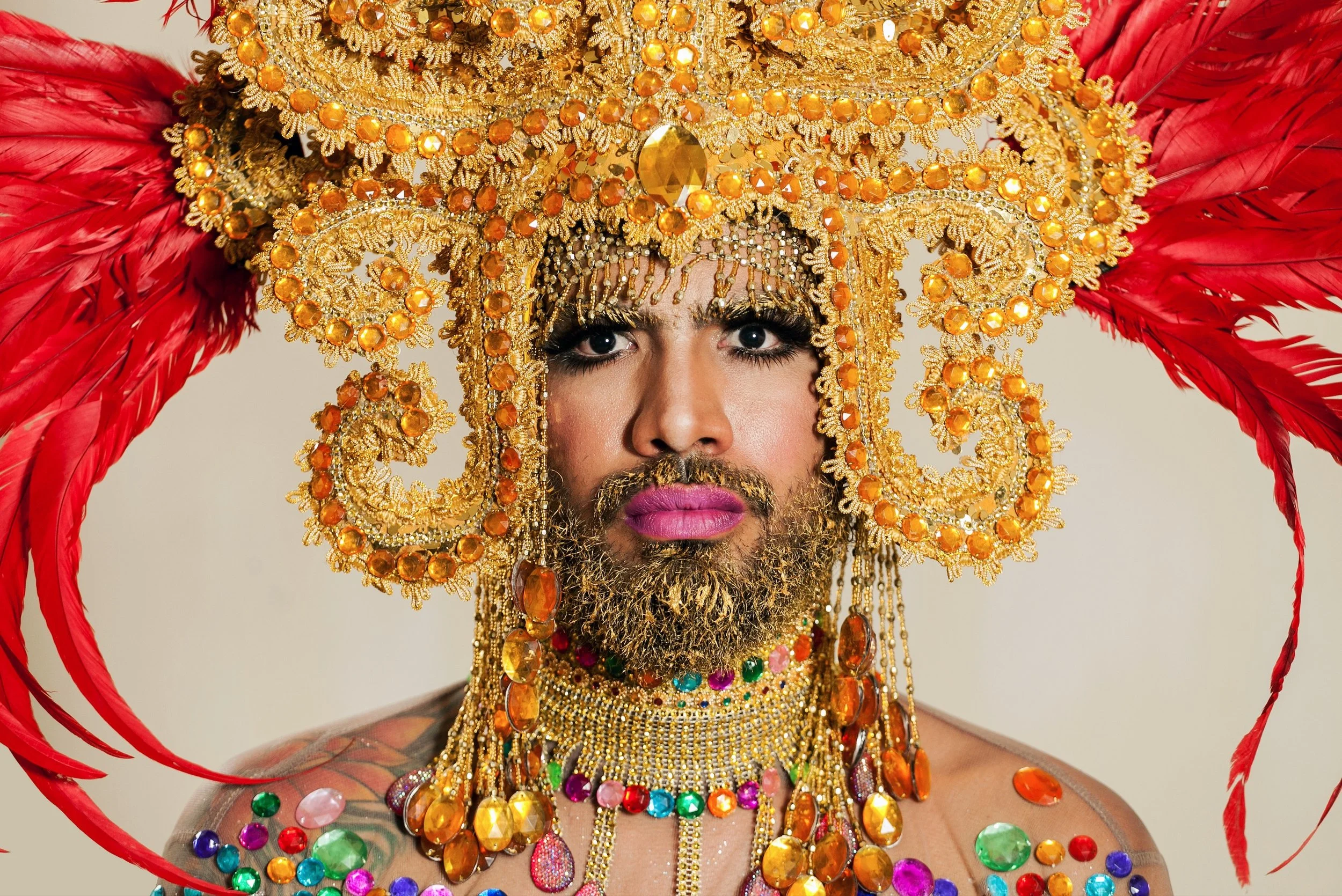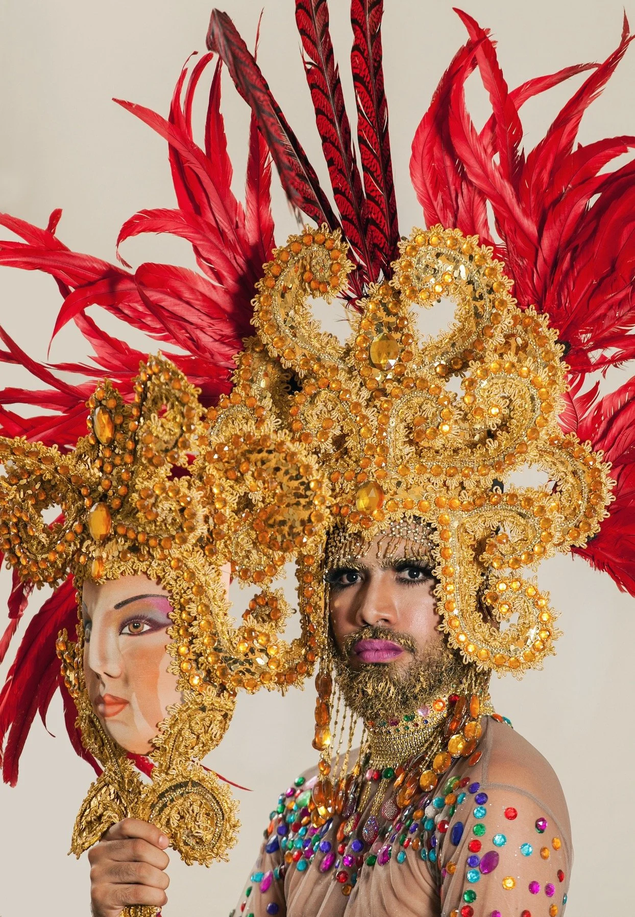 dress) informed by the local cultural practice “Baile de Negras”, where men dress as extravagant Spaniards women to mock colonial powers. The artist's dress represents a visual journey of the aesthetics used by governments in power in the country‘s recent history. Their intervention is claiming space for queer bodies. It challenges the notions of control and ownership over the revolutionary discourse in the history of their country, taking back power for queer futurity.